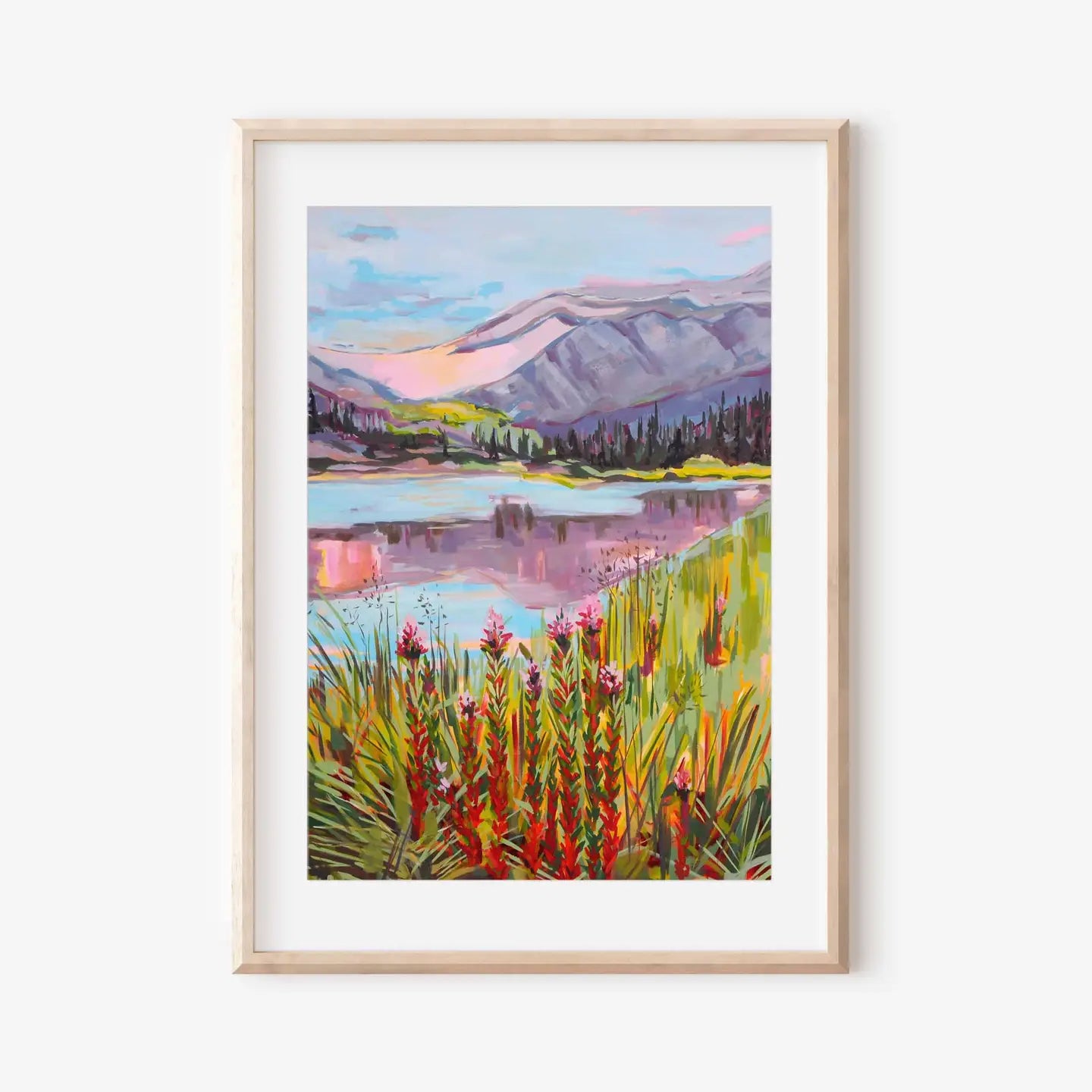 Capture the vibrant beauty of nature with this stunning art print featuring a colorful mountain landscape and flowing river under a radiant sunset. The vivid hues of the mountains and sky create a mesmerizing contrast with the whimsical wildflowers in the foreground. Perfect for bringing a cheerful and uplifting touch to any space, this print embodies the joy and serenity of the great outdoors.